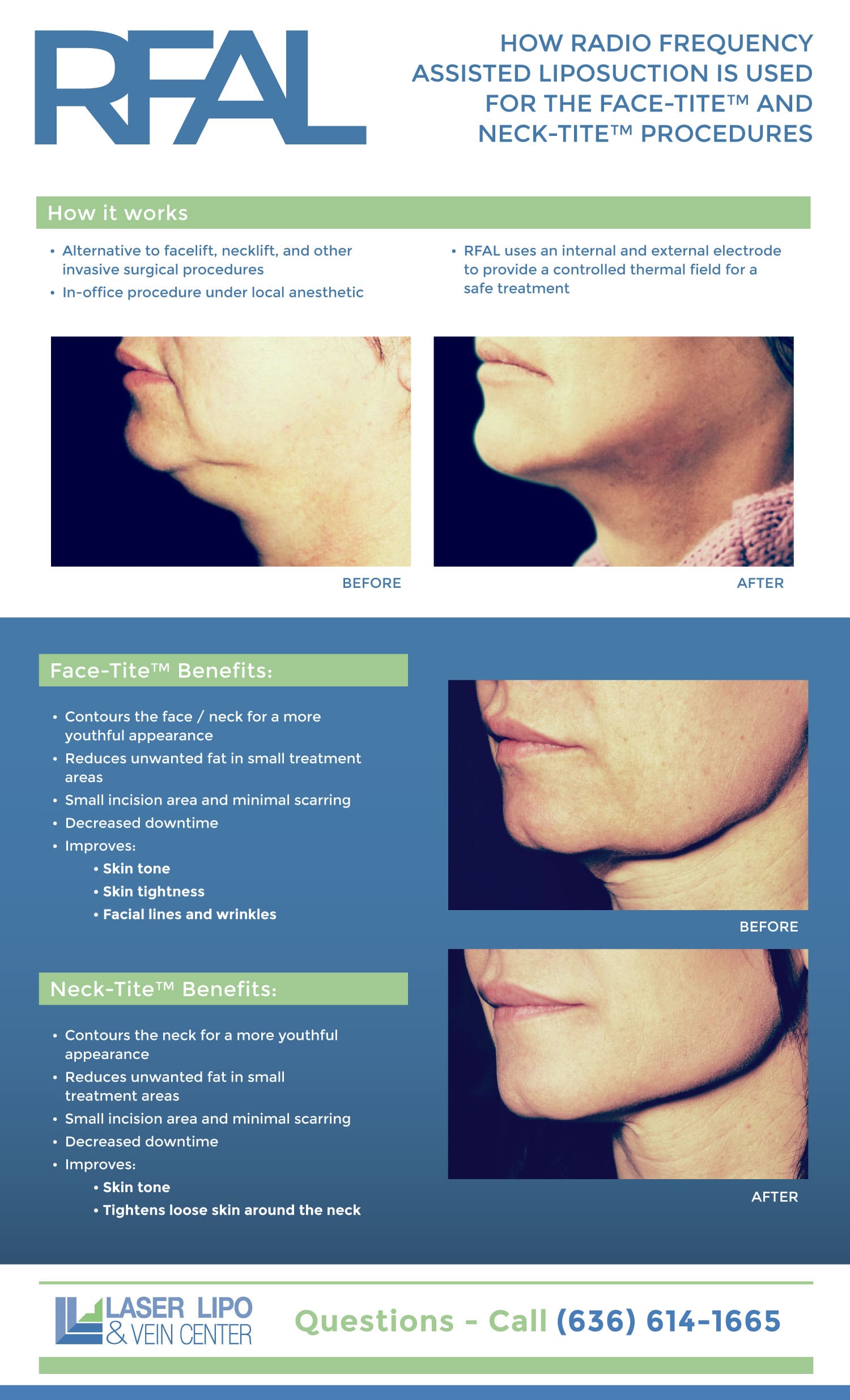 Face Tite is a new Radio Frequency Assisted Liposuction (RFAL) technology approved by the FDA that will help eliminate the problem areas of your face and chin. This device uses radiofrequency energy to tighten, smooth and lift problem areas on the face and neck to pinpoint results. The procedure is minimally invasive and a great option for patients who want to remove fat deposits and tighten their skin, but do not want to undergo extensive plastic surgery or show large scarring in the process. Face Tite is ideal for small treatment areas on the face, cheeks, jowls, and chin that need skin tightening, contouring, and fat reduction.