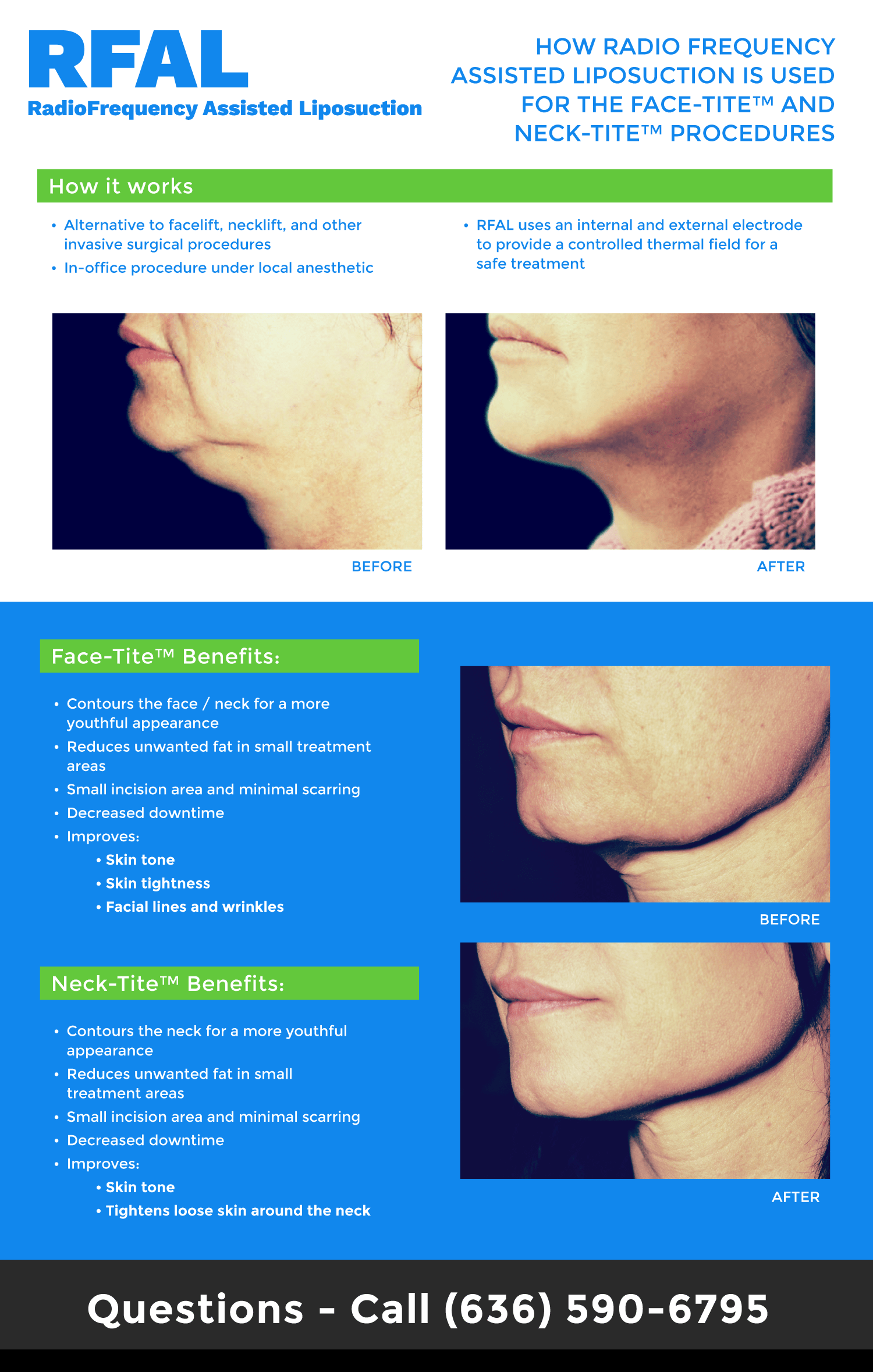 Neck Tite is a new Radio Frequency Assisted Liposuction (RFAL) technology that will help eliminate the problem areas of your neck and chin. Neck Tite offers a new answer to many of the problems of traditional surgery. The procedure is minimally invasive and a great option for patients who want to remove fatty deposits and tighten their skin, but do not want to undergo extensive plastic surgery or show large scarring in the process. face.htmlNeck Tite is ideal for small treatment areas on the neck and jowls that require skin tightening, contouring, and fat reduction.
